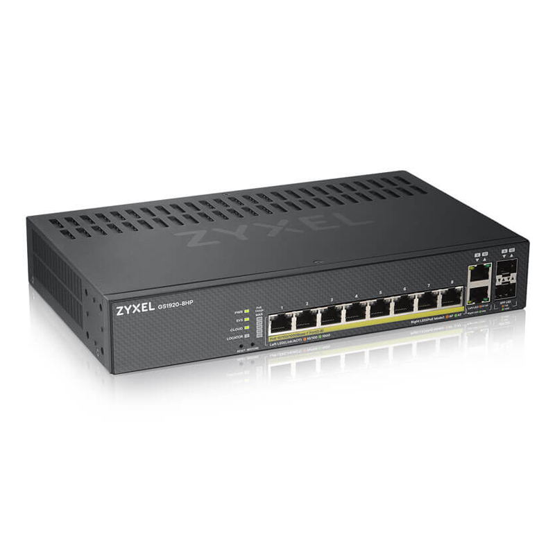 Die GS1920v2 Serie liefert 30 Watt (802.2at) PoE+ an jedem Port und bietet bei den größeren Modellen ein großes PoE+ Budget von insgesamt 375W. PoE wird durch intelligentes PoE erweitert, so dass der Switch den angeschlossenen Geräten die tatsächlich benötigte Leistung liefern kann, ohne dass bei der PoE-Zuweisung Energie verloren geht. Dank dieser Konzeption unterstützt der Switch mehr PoE-Geräte per Switch als herkömmliche Smart Managed Switches, selbst Geräte mit hohem Stromverbrauch wie CCTV und WLAN-APs.